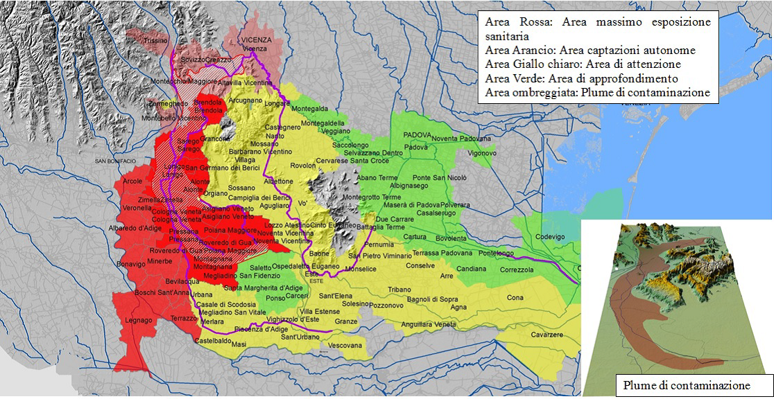 L’area interessata dall’inquinamento da sostanze perfluoroalchiliche (PFAS) è pari a circa 180 km2 di un vasto territorio che si estende tra le province di Vicenza, Verona e Padova, per una popolazione stimata di 300 mila abitanti. All’interno di questo territorio trenta comuni si sono trovati a dover far fronte all’inquinamento anche dell’acqua potabile, visto che la loro fonte di approvvigionamento risulta fortemente inquinata dai PFAS. Attualmente per rispettare i limiti obiettivo imposti dalla Regione Vento su indicazione dell’ISS, questi comuni hanno dovuto dotarsi di un sistema di filtrazione a carboni attivi, un sistema molto costoso. I filtri devono essere cambiati ogni 4 mesi al costo di c.a. 600.000,00 Euro annui.
