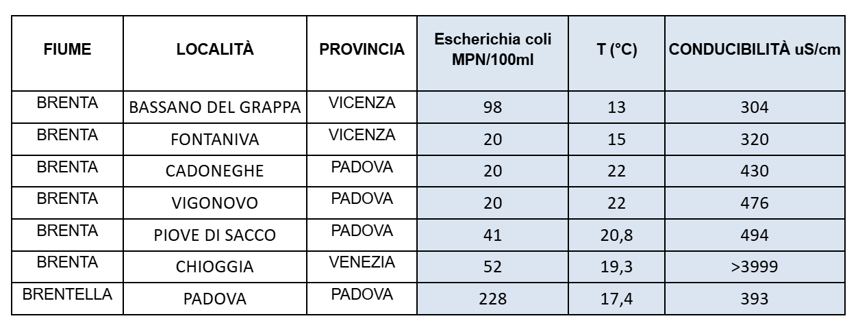 Nei 5 punti monitorati dai nostri volontari nel fiume Brenta, per i parametri di escherichia coli, nessuno supera il valore di 1000 (MPN/100ml). Nella norma anche i campioni di acqua prelevata nel canale Brentella.