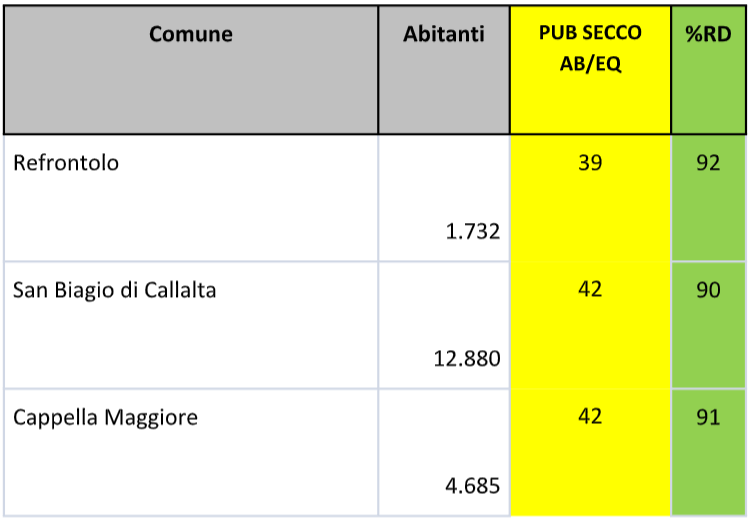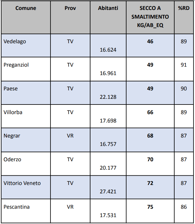 La medaglia d’oro di questa speciale classifica la vince il comune di Refrontolo con soli 39 kg pro-capite non riciclati e con una raccolta differenziata del 92%, seguito da altri 2 comuni del trevigiano: San Biagio di Callalta e Cappella Maggiore, entrambi con 42 kg abitante di rifiuto a smaltimento e una raccolta differenziata del 90%.