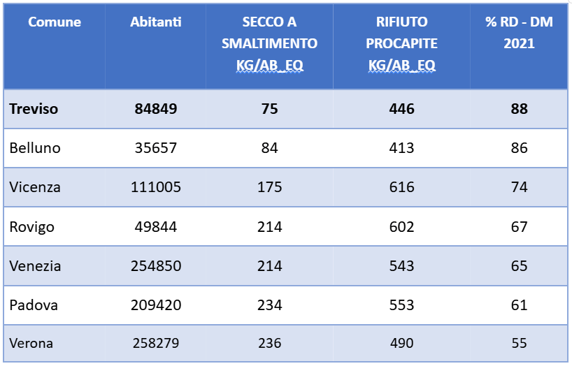 Per quanto riguarda i Comuni più popolosi il primato va a Montebelluna che con 62 kg abitante a smaltimento e il 90% di raccolta differenziata; seguono Castelfranco Veneto, Mira, Conegliano e Treviso.