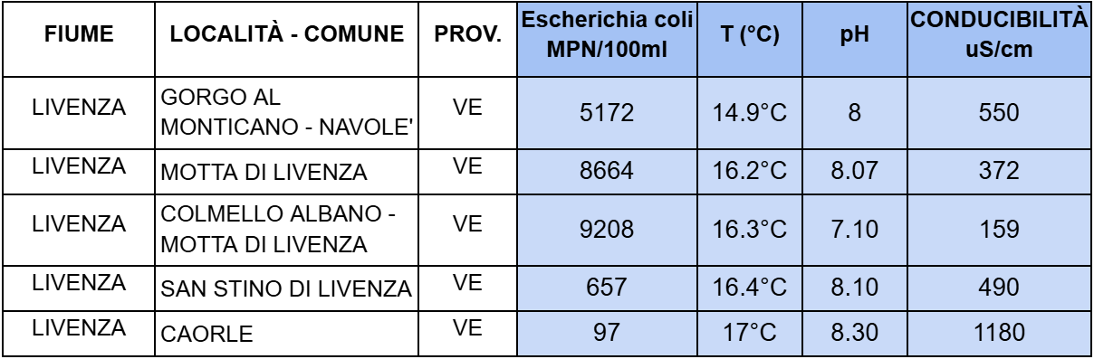 Tabella di sintesi dei dati raccolti sul Livenza per la campagna “Operazione fiumi”