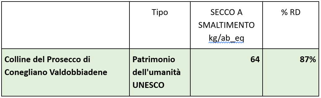 Per quanto riguarda i luoghi Patrimonio Mondiale UNESCO, è stato preso in esame il luogo denominato “Le Colline del prosecco di Conegliano Valdobbiadene” essendo l’unico sito Patrimonio Mondiale ad insistere su più Comuni nella stessa provincia. Vengono premiati quindi come Ricicloni i parchi che conseguono l’obiettivo del Piano Rifiuti Veneto ovvero un rifiuto urbano residuo inferiore a 80 kg per abitante e una percentuale di RD di almeno 84%. Le Colline del Prosecco di Conegliano Valdobbiadene guadagnano invece il titolo di “Rifiuti Free” con una produzione di rifiuto a smaltimento inferiore a 75 kg procapite.