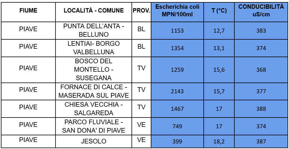 Per la tappa di San Donà il corso d’acqua messo sotto la lente di ingrandimento è il Piave, monitorato in 7 punti. I soli punti nel venziano, a San Donà e Jesolo, risultano sotto la prima soglia di allerta dei 1000 MPN/100ml, indicata da Arpav come il valore entro il quale si comincia a prendere in considerazione la possibilità di porre delle restrizioni per l’uso irriguo delle acque. Tutti gli altri 5 punti, seppur di poco, superano tale valore, rimanendo comunque entro il limite consigliato allo scarico (5000 MPN/100ml).