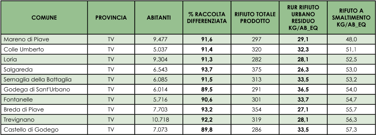 Mareno di Piave (Tv) comanda la classifica dei comuni con popolazione tra i 5000 ed i 15000 abitanti con 48 kg ed il 91,6% di raccolta differenziata. Mareno di Piave risulta al primo posto anche nella classifica generale fregiandosi del titolo di primo classificato in assoluto. Seguono Colle Umberto e Loria, Comuni della provincia di Treviso.