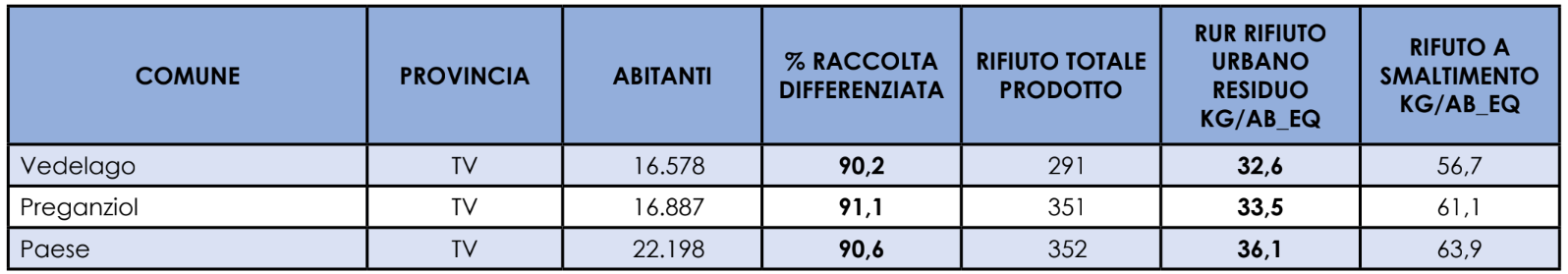 Vedelago (Tv) si conferma come miglior comune sopra i 15000 abitanti con 56,7 kg pro-capite ed il 90,2% di raccolta differenziata. Seguono a ruota Preganziol e Paese della provincia di Treviso.