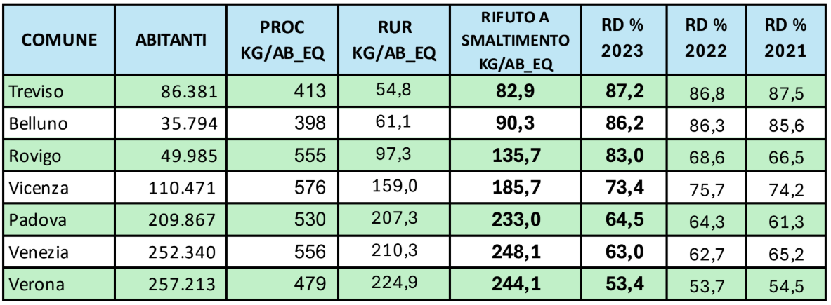 TREVISO SEMPRE PRIMO TRA LE CITTÀ CAPOLUOGO CON 87,2%, BELLUNO STABILE A 86,2%, ROVIGO ACCELERA E GUADAGNA IL TERZO POSTO CON L’83% DI RACCOLTA DIFFERENZIATA. VICENZA RETROCEDE AL 73,4% PADOVA STAZIONA A 64,5% COME VENEZIA A 63%.
