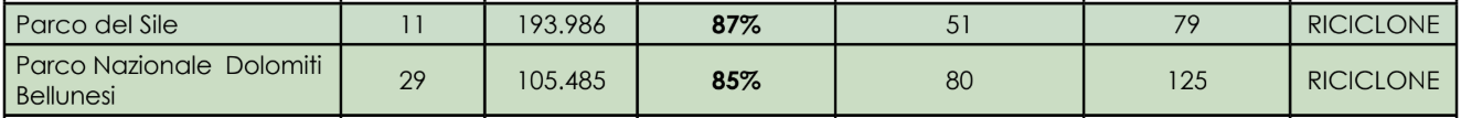 Altra classifica messa nuovamente in evidenza dal Rapporto è quella relativa ai parchi ricicloni. La gestione dei rifiuti, pur non essendo una competenza diretta degli enti gestori delle aree protette, se non viene realizzata in maniera corretta comporta degli effetti negativi per questi territori, poiché i rifiuti abbandonati sono un detrattore ambientale e fattore di perdita di biodiversità, e una inadeguata gestione del sistema di raccolta ha risvolti negativi per la qualità dell’ambiente naturale e l’attrattività turistica. I Parchi del Veneto che possono fregiarsi del riconoscimento di “Ricicloni” sono Il Parco regionale del Sile ed il Parco nazionale delle Dolomiti Bellunesi.