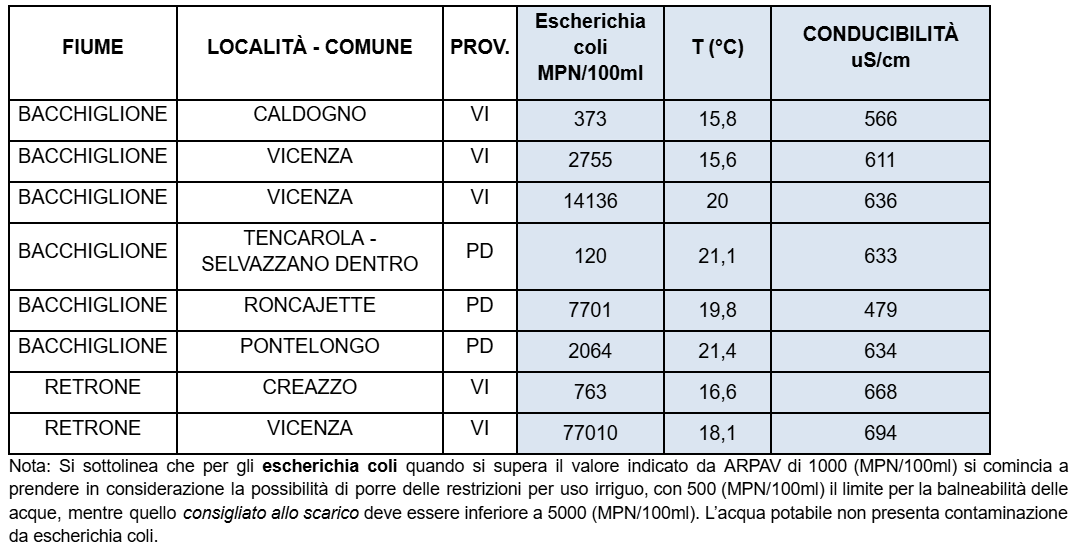 Nel dettaglio, un punto del Retrone a Creazzo supera il limite di balneabilità di 500 (MPN/100ml); due punti del Bacchiglione a Vicenza e Pontelongo (PD) risultano oltre il limite di qualità standard indicato da Arpav di 1000 (MPN/100ml); addirittura tre punti oltrepassano di molto il limite consigliato allo scarico 5000 (MPN/100ml): due punti del Bacchiglione a Vicenza e il già citato picco nel Retrone, sempre a Vicenza.