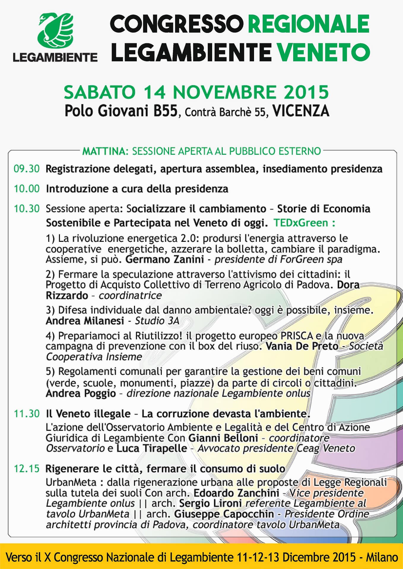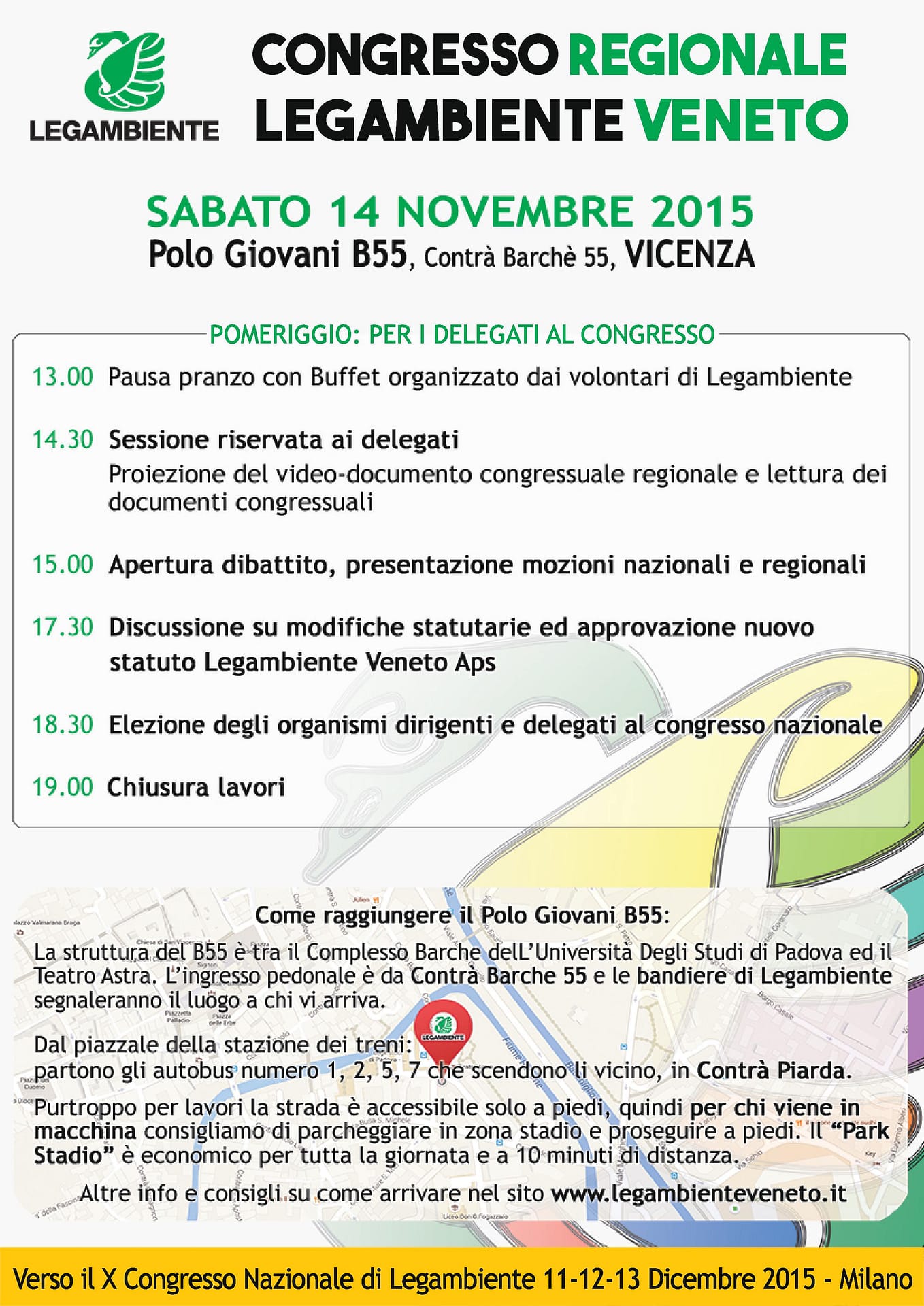 in data 14 novembre 2015 si terrà il Congresso Regionale di Legambiente Veneto a VICENZA in Contrà Barche 55. Qui in seguito troverete il programma dettagliato della giornata.