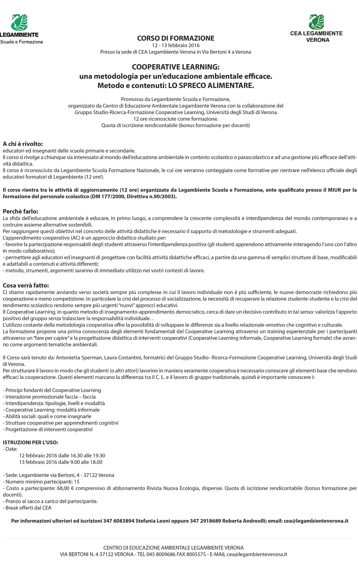 Il Corso è promosso da Legambiente Scuola e Formazione, organizzato da Centro di Educazione Ambientale Legambiente Verona con la collaborazione del Gruppo Studio-Ricerca-Formazione Cooperative Learning, Università degli Studi di Verona.