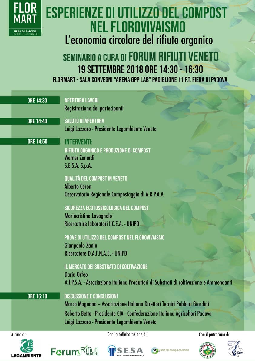 Forum Rifiuti Veneto – Legambiente Veneto organizzano il seminario ” Esperienze di utilizzo del compost nel florovivaismo: l’economia circolare del rifiuto organico” che si terrà mercoledì 19 settembre 2018 dalle 14.30 alle 16.30 presso la sala convegni “Arena GPP lab” Padiglione 11 p.t. Fiera di PADOVA nell’ambito di FLORMART