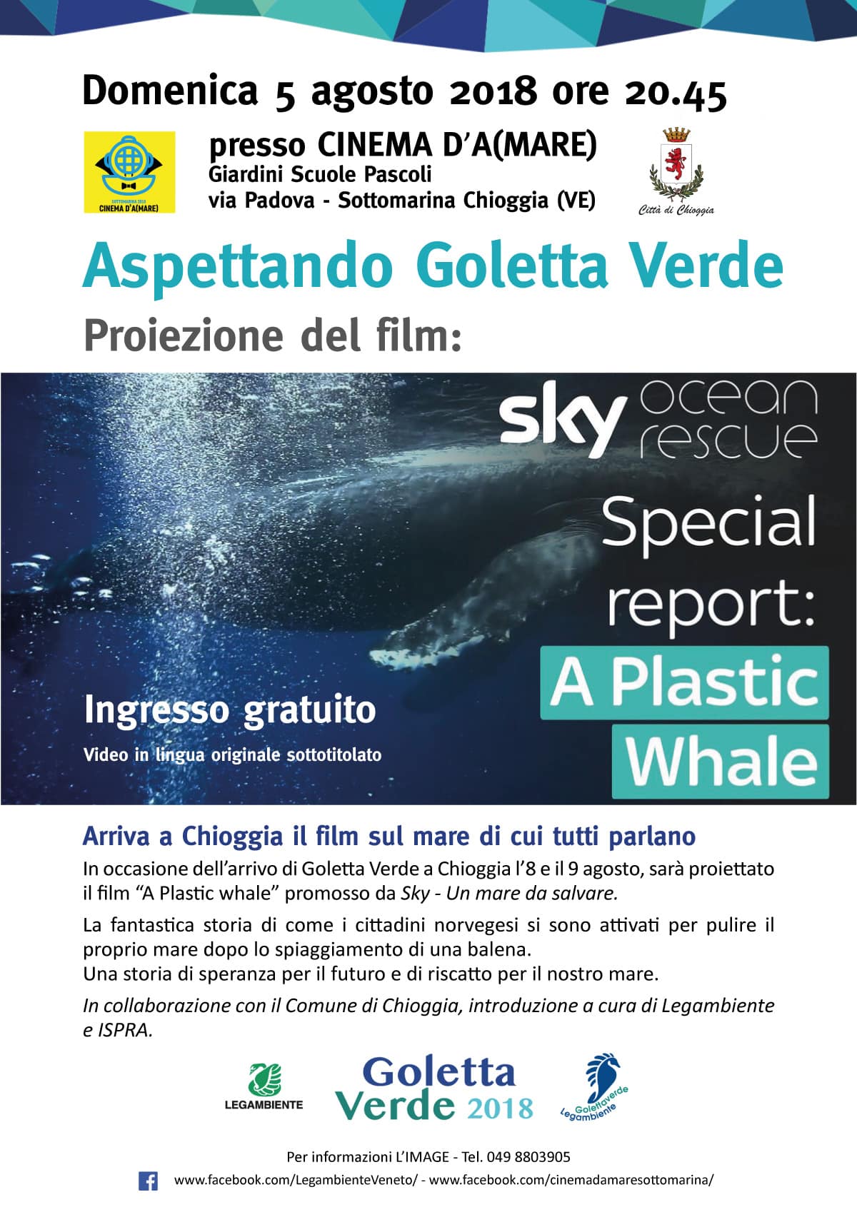 In occasione dell’arrivo di Goletta Verde a Chioggia, sarà proiettato il film “A Plastic whale” promosso da Sky – Un mare da salvare.