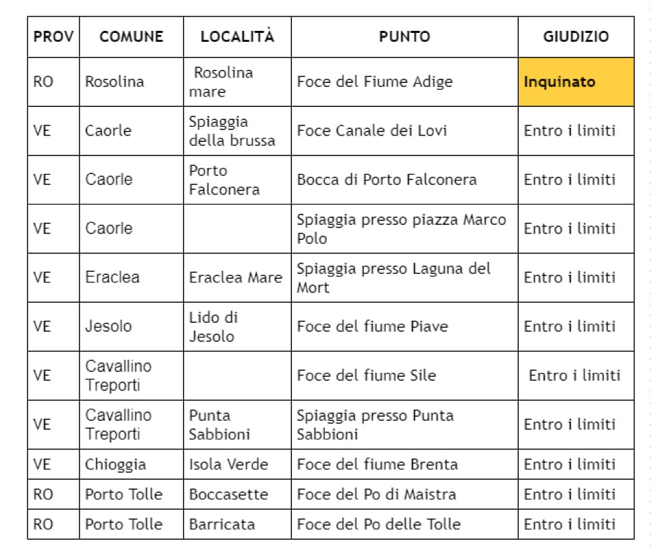 Questi gli altri punti monitorati, le cui acque sono state giudicate con inquinanti “entro i limiti di legge”: nel comune di Caorle (presso la Foce Canale dei Lovi, la Bocca di Porto Falconera e Spiaggia presso piazza Marco Polo  ); nel Comune di Eraclea (Spiaggia presso Laguna del Mort);  nel Comune di Jesolo (Foce del fiume Piave); nel Comune di Cavallino Treporti (Foce del fiume Sile e Spiaggia presso Punta Sabbioni); nel Comune di Chioggia (Foce del fiume Brenta); nel Comune di Porto Tolle (Foce del Po di Maistra e Foce del Po delle Tolle )