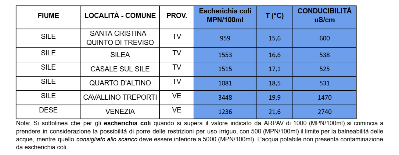 Le indagini microbiologiche delle acque si sono svolte nel mese di maggio: in totale sono 114 i campioni raccolti lungo i principali corsi d’acqua della regione e consegnati ai laboratori di Arpav. Con la ricerca di questi inquinanti Legambiente intende monitorare la presenza di eventuali criticità. I risultati dell’indagine chimica saranno presentati a fine anno con il report conclusivo della Campagna. La fotografia scattata da Legambiente non sostituisce i monitoraggi ufficiali ma si affianca alle indagini dell’Agenzia Regionale per la Prevenzione e Protezione dell’Ambiente che monitora con continuità i corsi d’acqua restituendo ogni anno un quadro completo dello stato di salute dei bacini idrografici della regione.