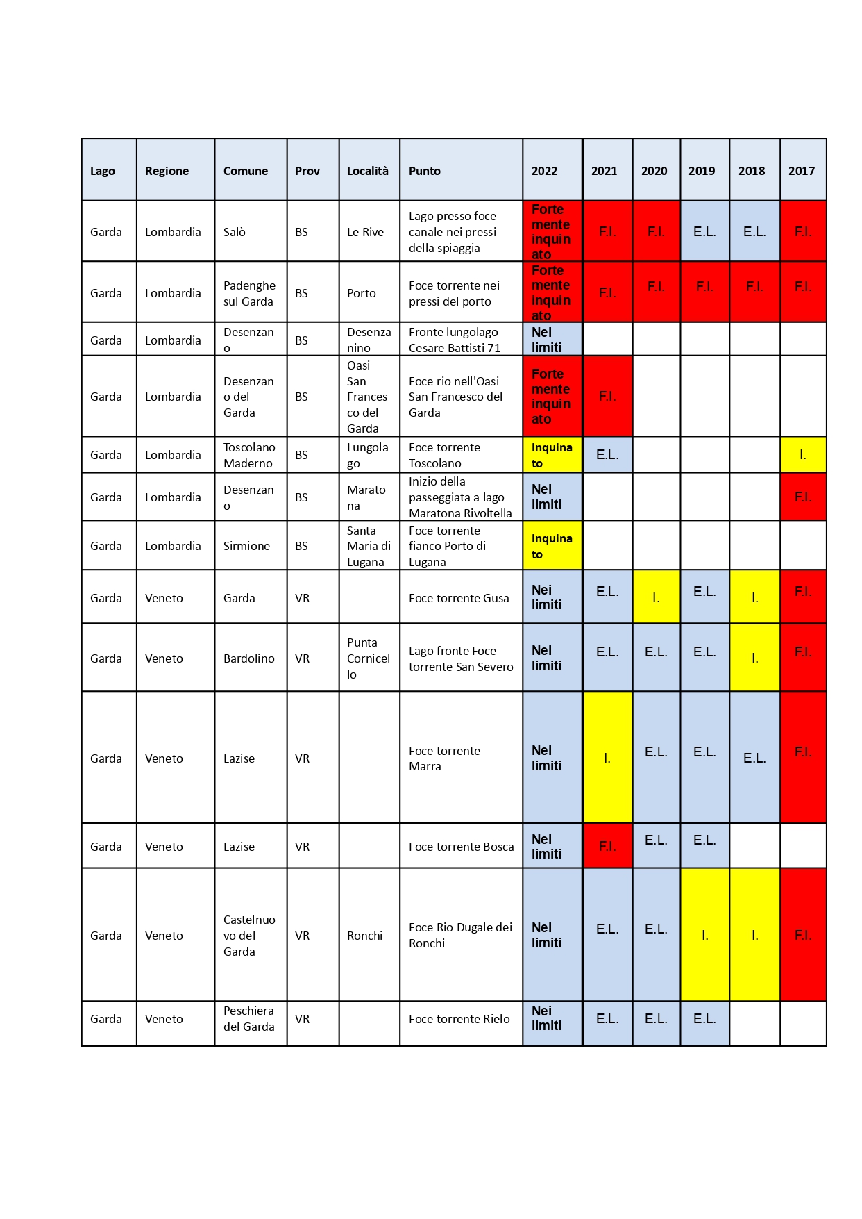 Sponda veneta. Tutti con concentrazioni inferiori ai limiti di legge previsti dalla normativa vigente in Italia sulle acque lacustri, i sei punti campionati sulla sponda veneta del Lago di Garda, nel Veronese: la foce del torrente Gusa a Garda; il lago di fronte alla foce del torrente San Severo in località Punta Cornicello a Bardolino; la foce del torrente Marra e la foce del torrente Bosca a Lazise; la foce del rio Duganale dei Ronchi in località Ronchi a Castelnuovo del Garda; la foce del torrente Rielo a Peschiera del Garda.