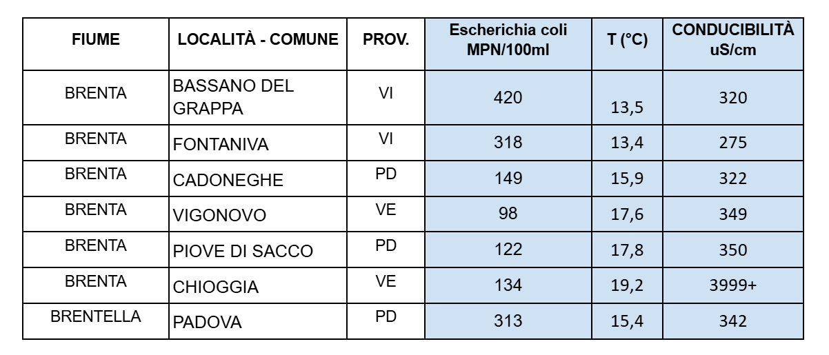 Per la tappa di Limena il fiume messo sotto la lente di ingrandimento da Legambiente è il Brenta, monitorato in 6 punti, oltre al canale Brentella, con un singolo punto a Padova. Entrambi i corsi d’acqua nelle edizioni passate di Operazione Fiumi non hanno mai presentato criticità sul fronte depurativo. Per quanto riguarda gli escherichia coli i campioni prelevati sono risultati in tutti i casi non solo sotto il valore di 5000 (MPN/100ml), limite consigliato allo scarico, ma anche di 1000 (MPN/100ml), valore entro il cui si comincia a prendere in considerazione la possibilità di porre delle restrizioni per uso irriguo. Anche il canale Brentella presenta quantitativi di batteri fecali entro i limiti.