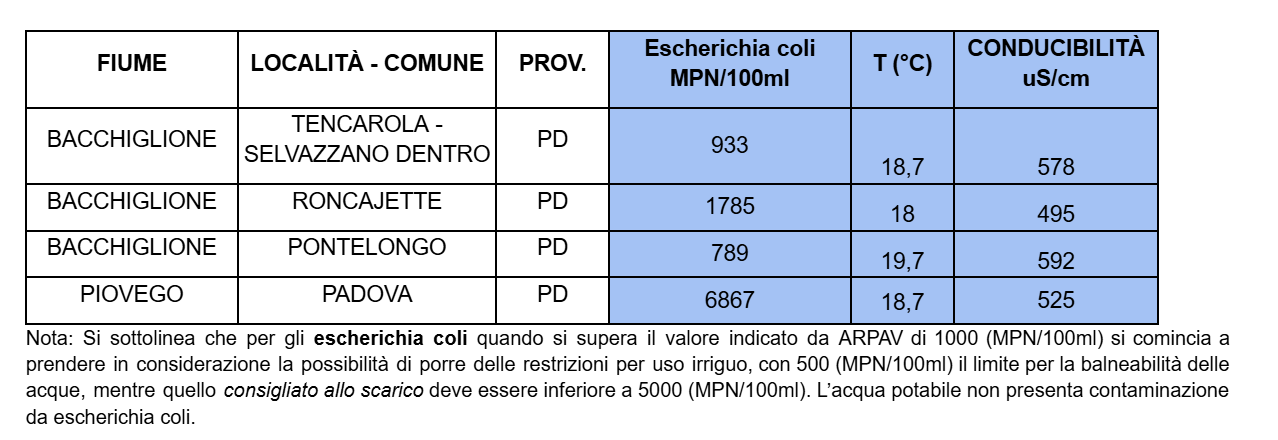 Per la tappa di Padova i corsi d’acqua messi sotto la lente di ingrandimento da Legambiente sono il il tratto padovano del Bacchiglione, monitorato in 3 punti, e il canale Piovego, con un singolo punto. Dei punti monitorati tra Bacchiglione e Piovego, i primi dati disponibili che riguardo in batteri fecali, 2 risultano sopra il valore dei 1000 (MPN/100ml), entro il quale si comincia a prendere in considerazione la possibilità di porre delle restrizioni per uso irriguo. In particolare il Piovego è risultato avere un valore superiore a 5000 (MPN/100ml), limite consigliato allo scarico, mentre a Roncajette (PD) dal 2021 sono stati registrati valori sempre sopra il limite consigliato da Arpav di 1000 MPN/100ml.