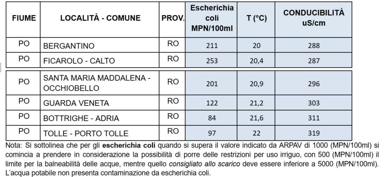 Secondo i dati raccolti da Legambiente nei 6 punti monitorati, considerato il solo parametro di escherichia coli, il Po risulta in salute: tutti i punti infatti rientrano nei limiti di qualità delle acque. Inoltre rispetto ai dati rilevati l’anno scorso la risalita del cuneo salino, causata dalla lunga crisi siccitosa, non si è verificata con la stessa intensità.